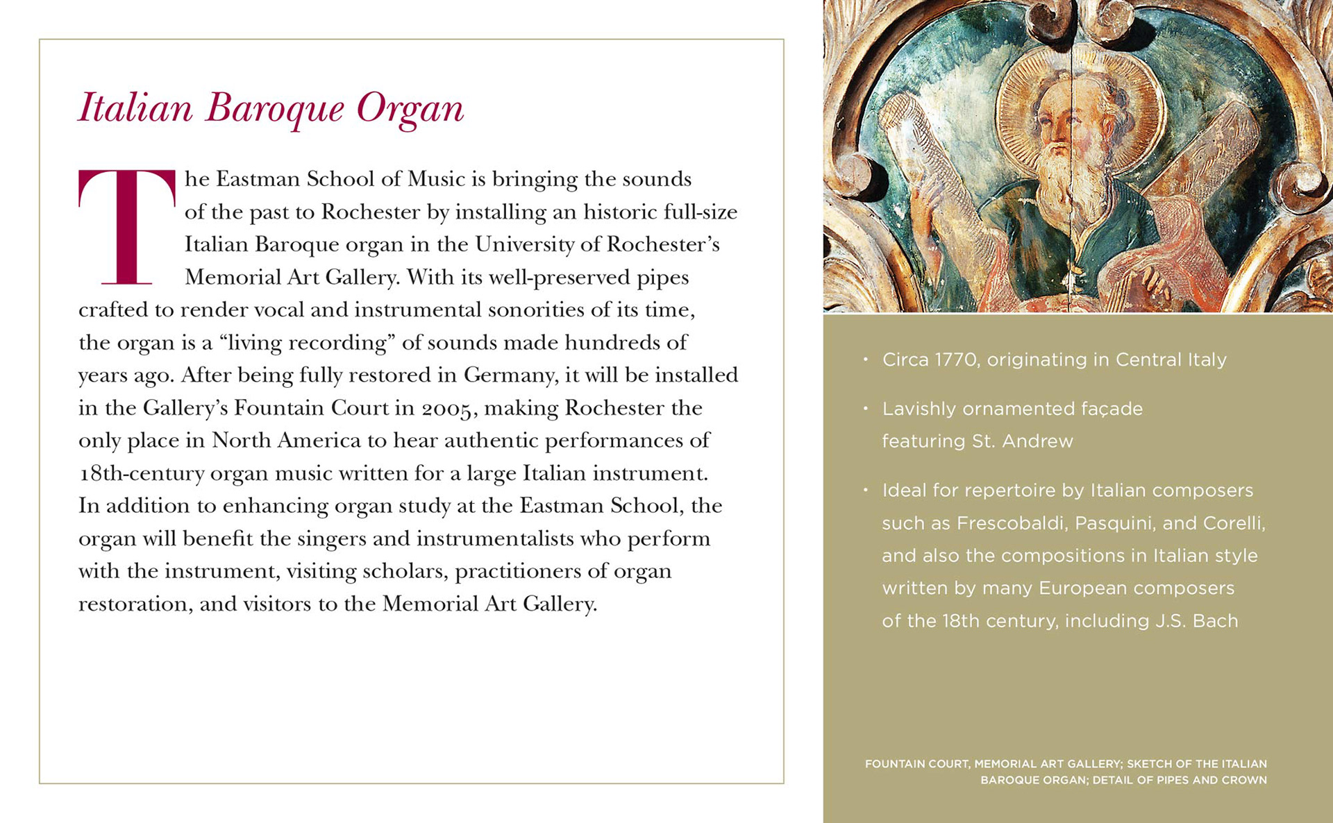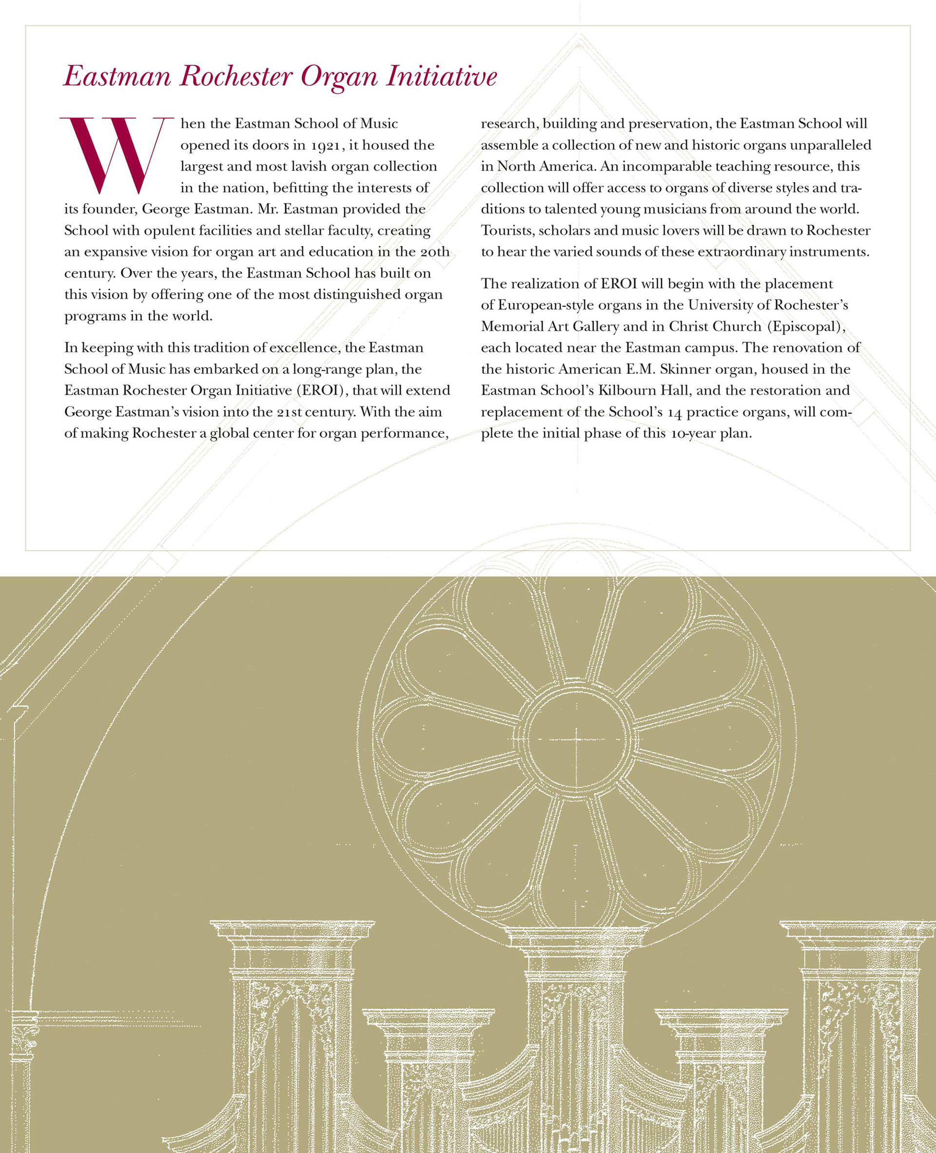 Informational mailing promoting the Eastman Rochester Organ Initiative, a project that sponsored the renovation and construction of historical and replica organs at the Eastman School of Music. The piece consisted of a folder and four cards describing each part of the project.