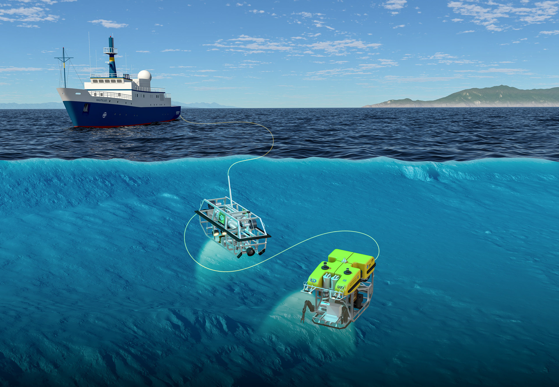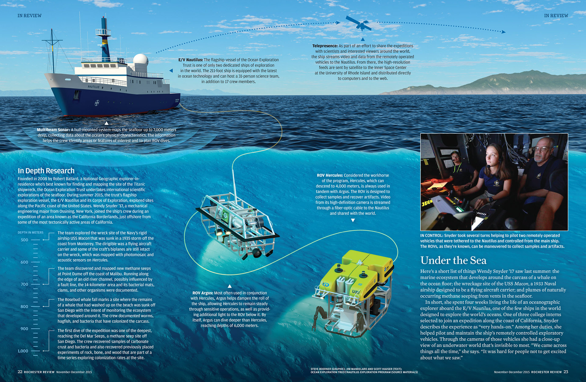 3D models of the E/V Nautilus and two submersible vehicles were created and rendered to illustrate the activities of one of two vessels in the world dedicated to sea exploration. The background, which depicts the shore and seabed off the coast of Southern California (including Catalina Island, right), was modeled in Terragen and is based on current digital elevation and bathymetric data sets.