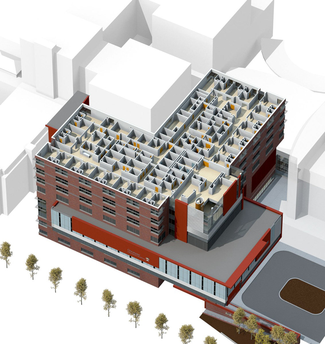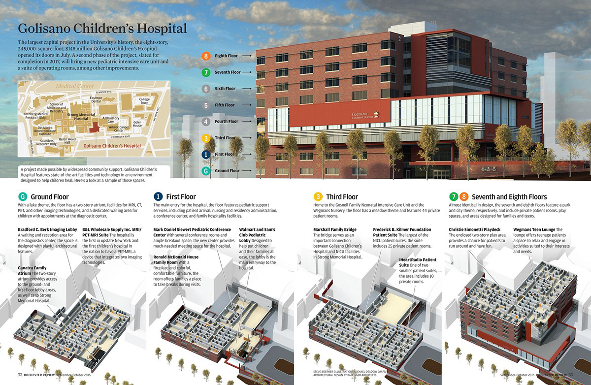 3D model and renderings are used in this infographic depicting the Golisano Children's Hospital, a new 8-floor, $145 million hospital opening at the University of Rochester Medical Center. The illustration was published in Rochester Review, the University's alumni magazine.