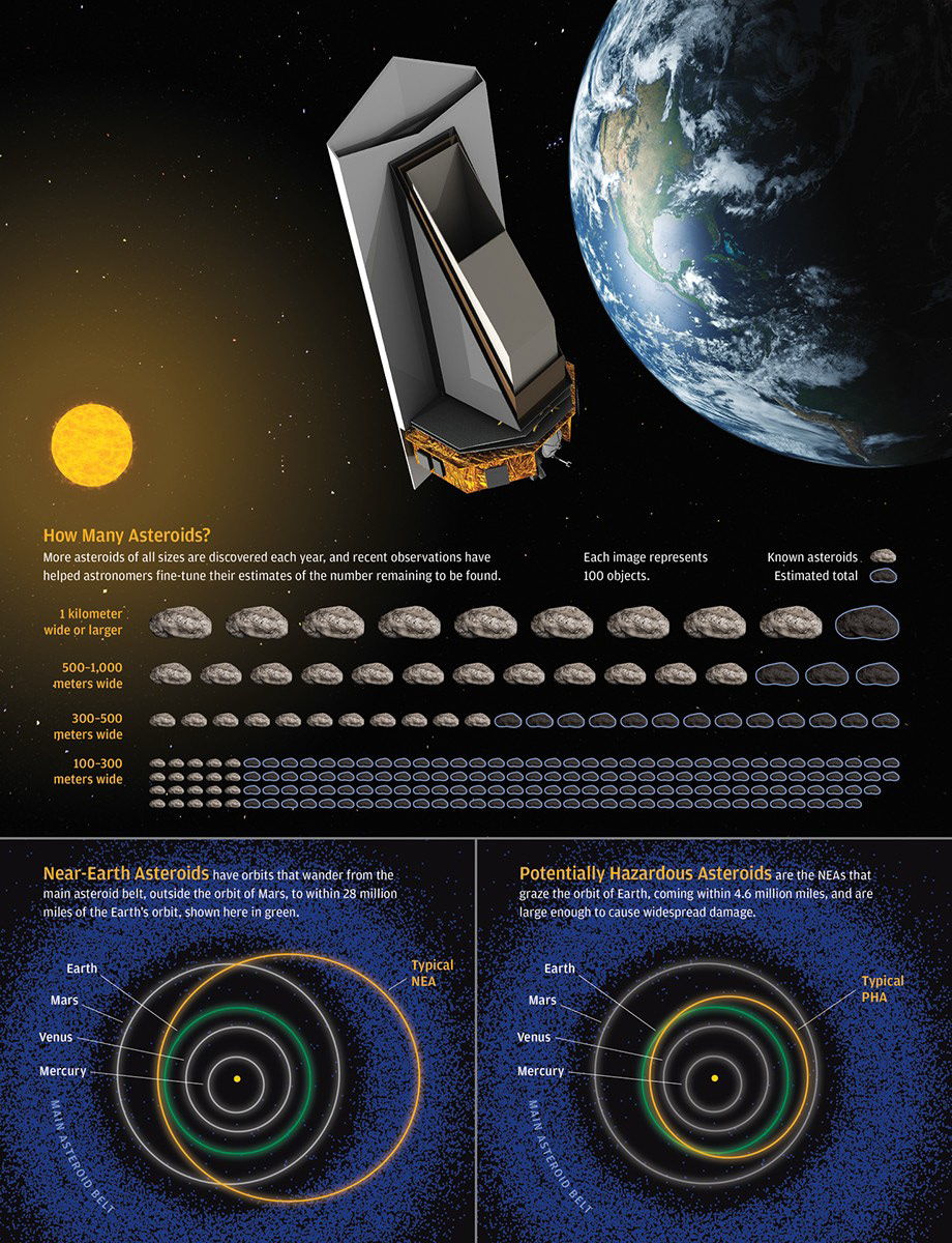 This informational graphic explains NEOCam, a proposed space telescope that would orbit near the earth and keep an eye out for dangerous asteroids. It was published in Rochester Review, the alumni magazine of the University of Rochester, in September 2013.