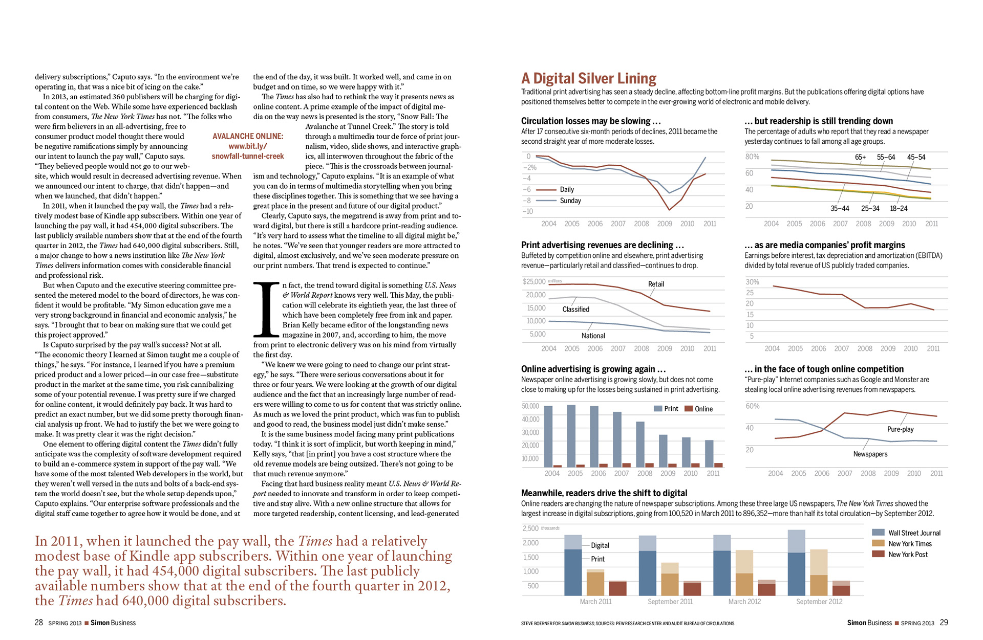 Data provided by Pew Research and the Audit Bureau of Circulations was combined in a storytelling fashion to explain how—and why—print advertising revenues are falling and how readership is shifting to digital media.
