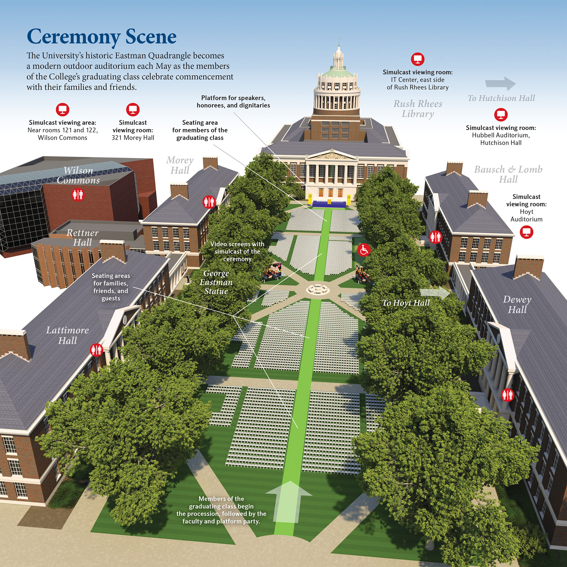 3D models of several buildings were combined to depict the Eastman Quadrangle on the University of Rochester campus. Accurate seating arrangements, video screens, and other details complete the illustration, used in a guide distributed to guests at the school's outdoor commencement exercises.